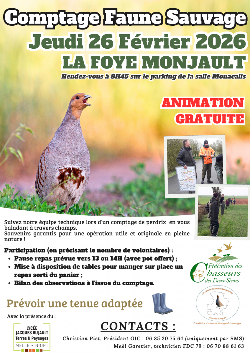 Catégorie Actualités Le Jeudi 26 Février 2026 Comptage des perdrix grises sur le GIC Courance et Mignon Partager cette page Transférer Facebook Twitter Print HTML