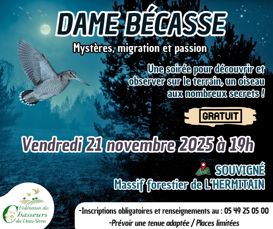 Nous vous proposons le Vendredi 21 novembre 2025 à 19h, une animation GRATUITE, une sortie nocturne à la découverte de DAME BÉCASSE !